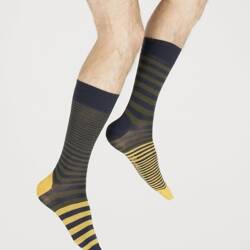 Chaussettes homme laine peignée rayures asymétriques bleu marine, kaki et jaune