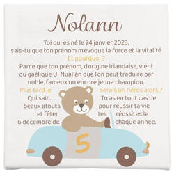 Toile personnalisée prénom bébé – Ourson en voiture vintage