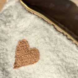 Trousse de beauté moumoute taupe ornée d'un coeur blanc et doublée d'un tissu beige à coeurs blancs
