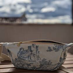 Sac Banane moumoute taupe ornée d'un coeur blanc et doublé d'un tissu beige à coeurs blancs
