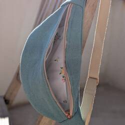 Sac banane moumoute taupe ornée d'un coeur blanc doublure parme libellules