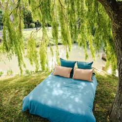 Parure en percale de coton biologique Le Carreau Bleu Paon - Housse de couette 260x240 cm + taies 65x65 cm