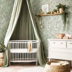 Papier peint motifs fleurs éclos sur fond papier vert, 50 cm x 10 m