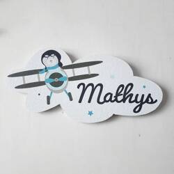 Plaque de porte nuage personnalisée – Ourson aviateur et avion biplan