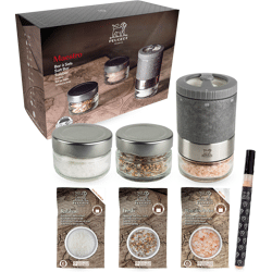 Maestro Bar à sels - moulin à sel u'Select accompagné de 3 réservoirs interchangeables, 2 sels d'origine et 1 mélange aromatique
