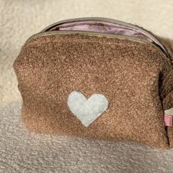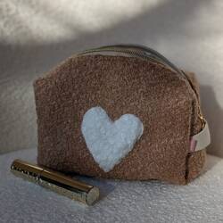 Trousse de beauté moumoute taupe ornée d'un coeur blanc et doublée d'un tissu beige à coeurs blancs